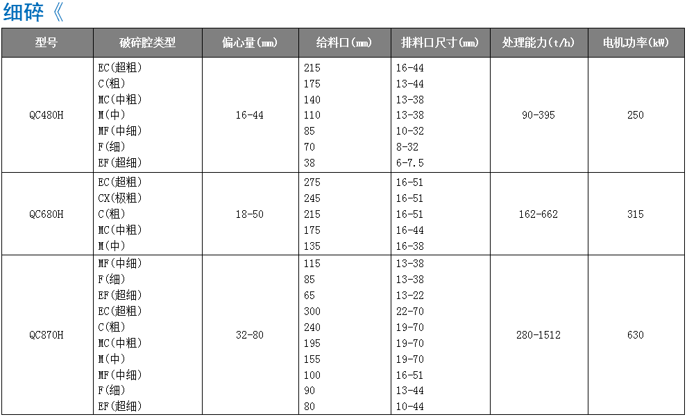 QC系列單缸圓錐破碎機具有高破碎率、高產(chǎn) 品質(zhì)量和低生產(chǎn)成本特性,能夠適用各種工況及破 碎物料,可滿足中碎、細碎及超細碎的破碎要求